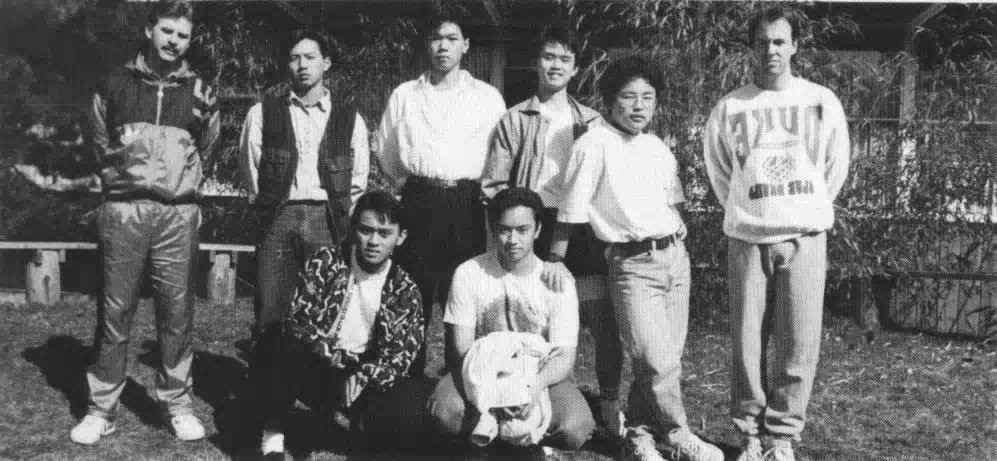 1993年,中学排球队合影。从左至右:Mr.Glassby老师、 Jason、 Rudy、Frank、Ray、我、一位忘记名字的队友、Mr. Beaten老师