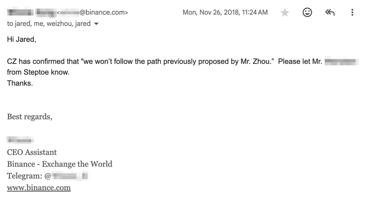 这个顾问曾是火币美国的法律顾问。他用「太极」作为代号,描述了一个他提议的新实体。《富比士》的文章发表后,我的团队很快找到了事件发生时我让助理发给币安内部的邮件,里面写得很清楚:「CZ已确认,我们不会按Mr Zhou的建议执行。」